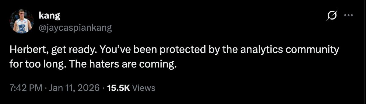I think the issue is that the dorks rank Hebert somewhere in the group below Mahomes, Allen and whatever other QB is having an MVP season any given year. And it’s really hard to get worked up over whether he is the 5th or 9th best QB.