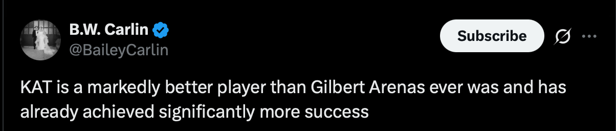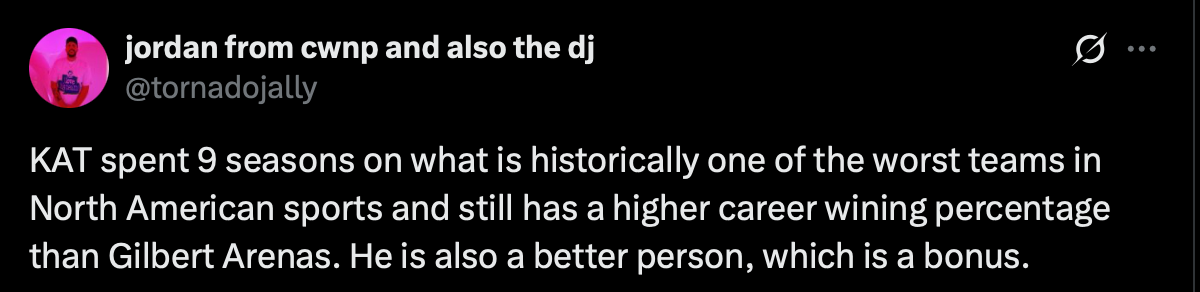 He also was one of the biggest, literally and figuratively, reasons the Wolves beat the Suns in the first round last year and the Nuggets in the second round. Yes, Ant was the best player on that team and Gobert was also impactful defensively, but KAT's play on both ends was the biggest driver of those playoff victories. Arenas NEVER came close to being as impactful as the playoffs as KAT was last season, or this season.