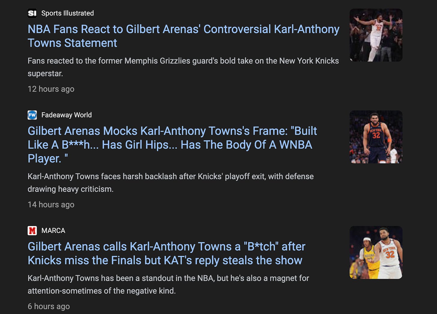 Some of the articles emphasize the “bitch,” others focus in on how Arenas said that the Knicks big man is “built like a WNBA player.” I’ll admit that I laughed but please don’t tell anybody. I’ve got a media reputation to uphold.