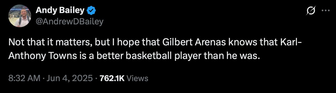 Gilbert Arenas is insane and played the main role in the destruction of his career. He was also, for three seasons, better than Karl-Anthony Towns ever was, and likely ever will be. This is a pretty low stakes argument, but I’m making it due to a pet peeve: In general, I dislike when we downgrade what someone does well because we’re mad at something they said. I also sometimes feel as though some people on NBA Twitter didn’t watch basketball before there was NBA Twitter. I don’t apply that characterization to screenshotted writer Andy Bailey because he’s tweeted nice things about House of Strauss articles and thus must contain an abundance of basketball wisdom. I do happen to disagree with him on this, though.