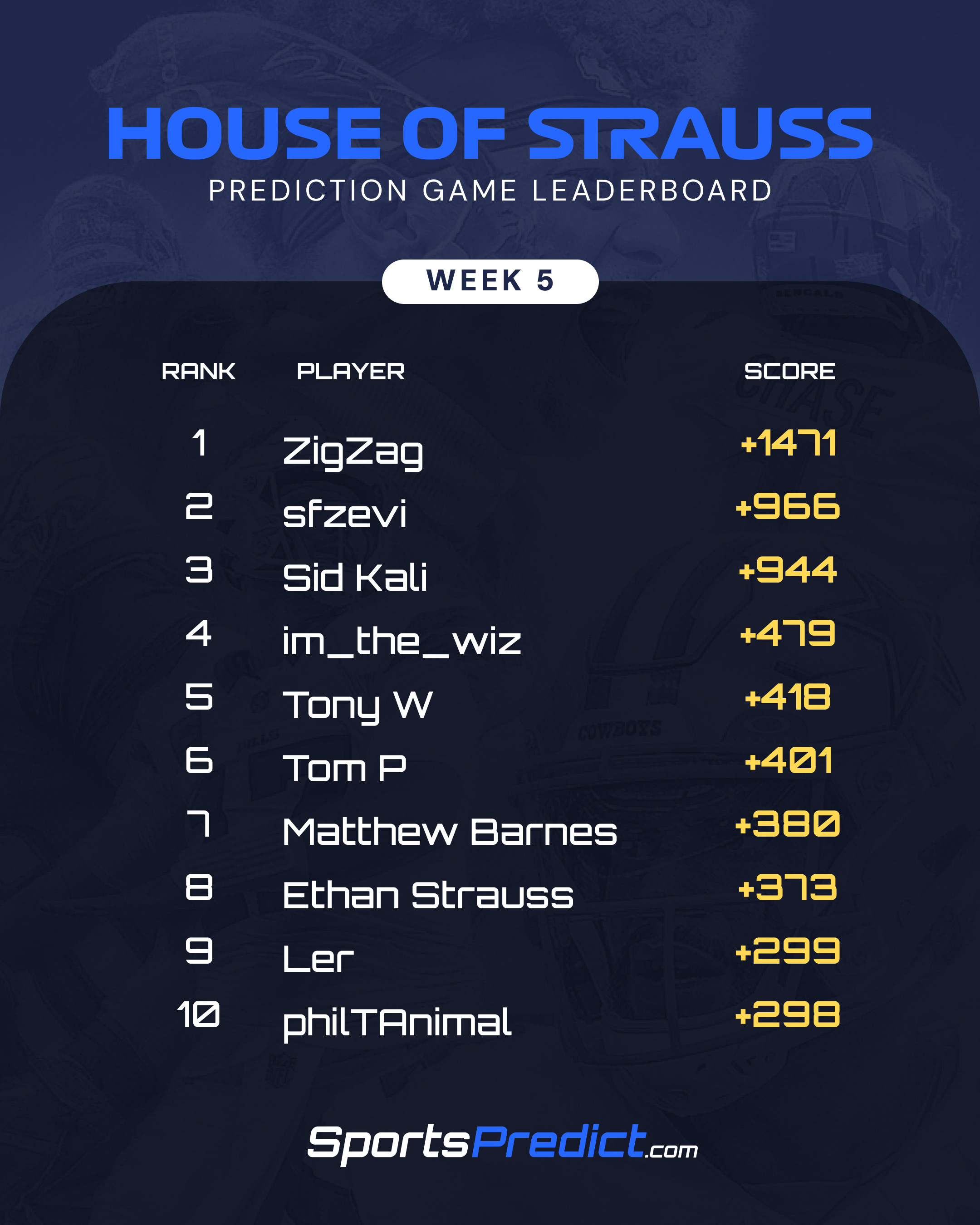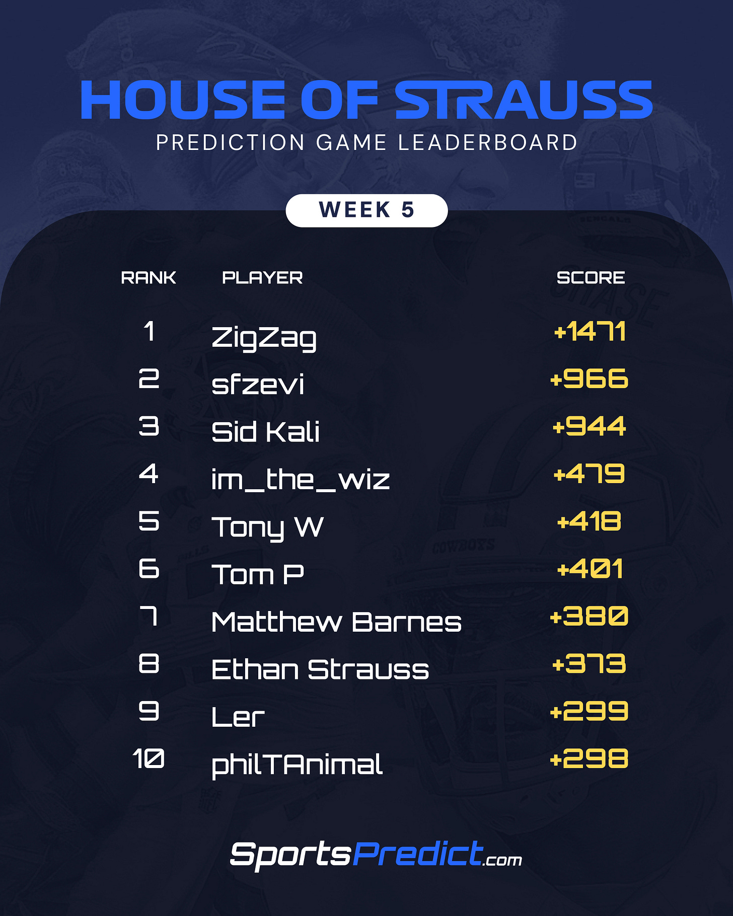 No Kuhn Pod this week due to scheduling, but our SportsPredict.com (Password HOS for the House of Strauss Lobby) contest remains. Zigzag, you are afforded the incredible prize that is a 30 minute conversation with yours truly. Email me at houseofstrauss@substack.com to collect. If that’s not working, there’s another email I’ll drop underneath the below paywall.