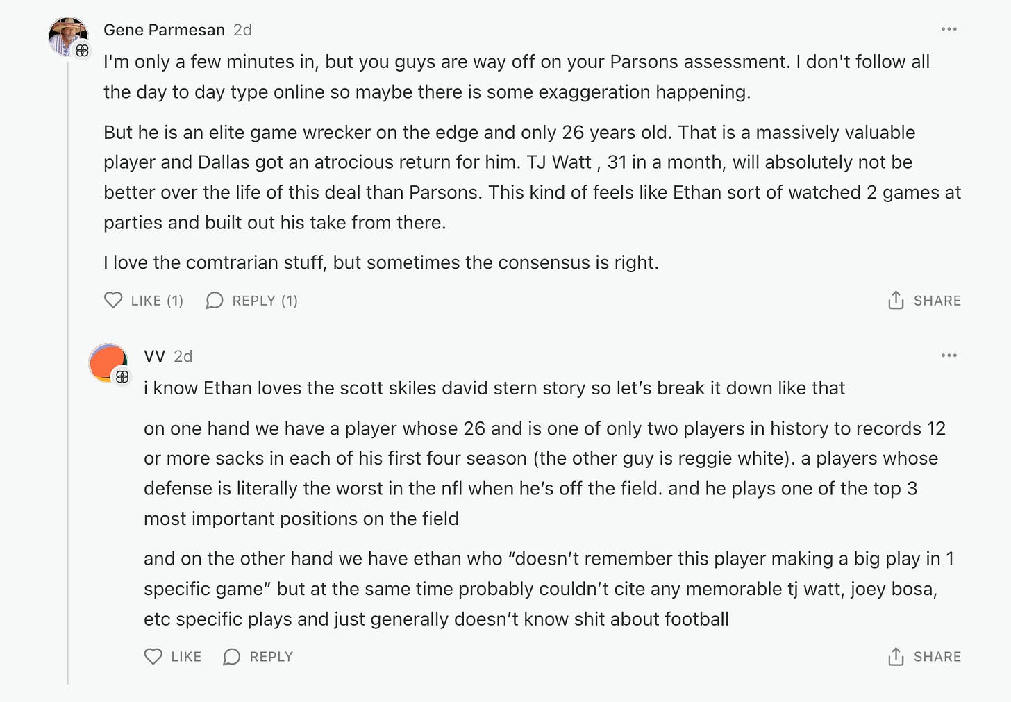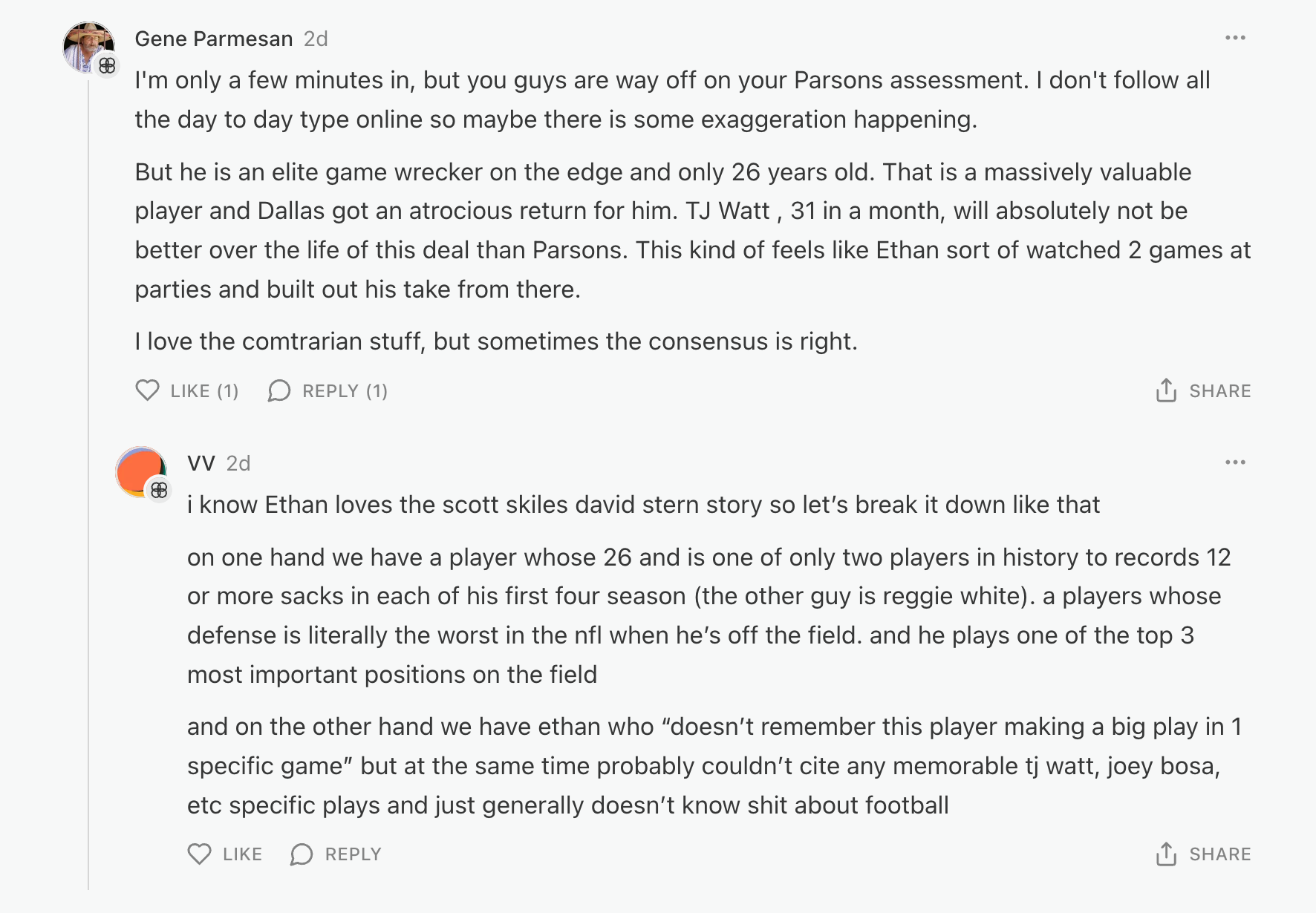 Ryan Glasspiegel and I talked some Micah Parsons trade on the last Random Offense. Some of you subscribers DARED disagreed with me, America’s Foremost NFL writer.