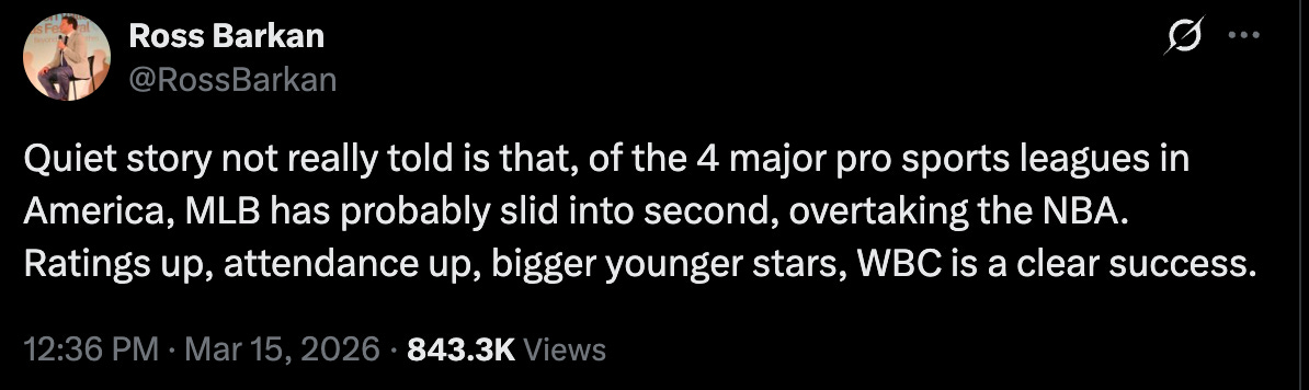 It seems Ross Barkan kicked up some dust by suggesting that MLB has overtaken the NBA as our nation’s most popular non football sport.