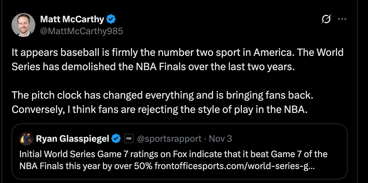 So is baseball actually America’s second favorite sport now? I’d argue that the main reason MLB has a case here isn’t the pitch clock, though I do like the pitch clock. I also wouldn’t cite “too many 3-pointers,” or other aesthetic theories as the main reason the NBA fell behind. No, the championship game chasm is mostly due to recent structural CBA changes that Adam Silver instituted.