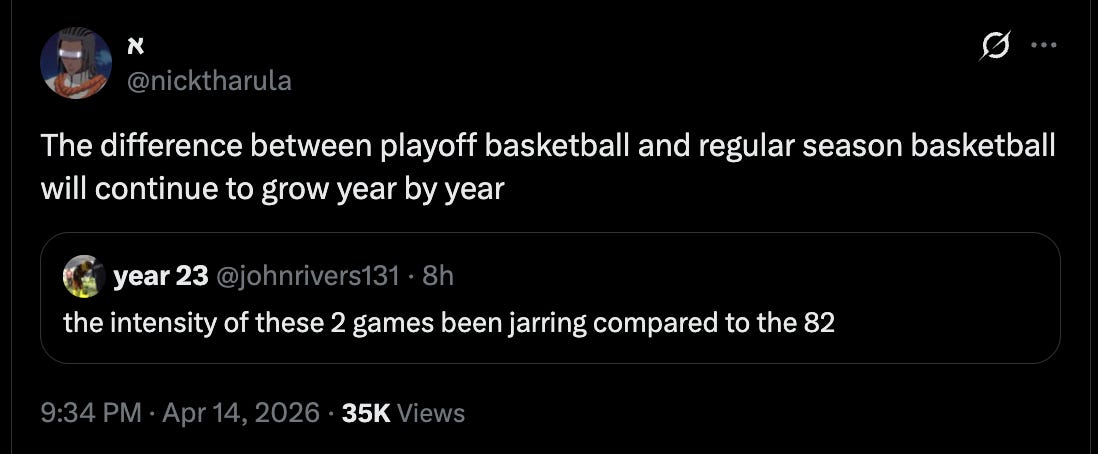 People think the regular season games don’t matter because of availability of players compared to previous eras. There’s a few things that feed into that notion in the mind of fans: 1) more access to games and coverage than ever before. Anything that happens with the league is covered granularly, while in past times, many stories remained localized. 2) pace and space era has accelerated star injuries and the need to sit players, which makes fans think the regular season doesn’t matter (especially when guys sit out national tv games). 3) Quants run teams now, so when the math says a team should run more to win (even if it pace and space is making players more injury susceptible), they do it. If the math says a player should sit for potential injury risk or that a team should blatantly tank the year out to secure a better place in a talented draft, that’s what is gonna happen. Zero consideration for how it will impact perception of the league. But I don’t blame the quants for that as much as the league for not preventing this from becoming the bible of the nba.