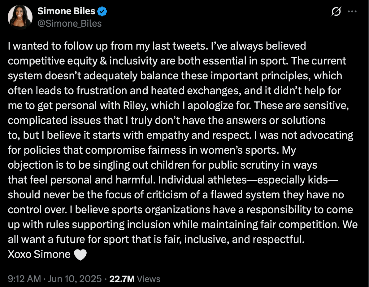 In a different time, Biles would likely have seen little visible backlash to her words. In a different time, someone like Riley Gaines wouldn’t even be allowed on Twitter. The prominent responses to such a Biles’ excoriation of a right wing activist would be cheerleading for the gymnast and scorn for the target. Instead, on this version of Twitter, you see a lot of high follower accounts dumping all over the Biles tweets. And sometimes, it’s just this simple. The celebrity will apologize if the medium they use is shouting at them. Change what the medium shouts at, and change what the celebrity will proudly say.