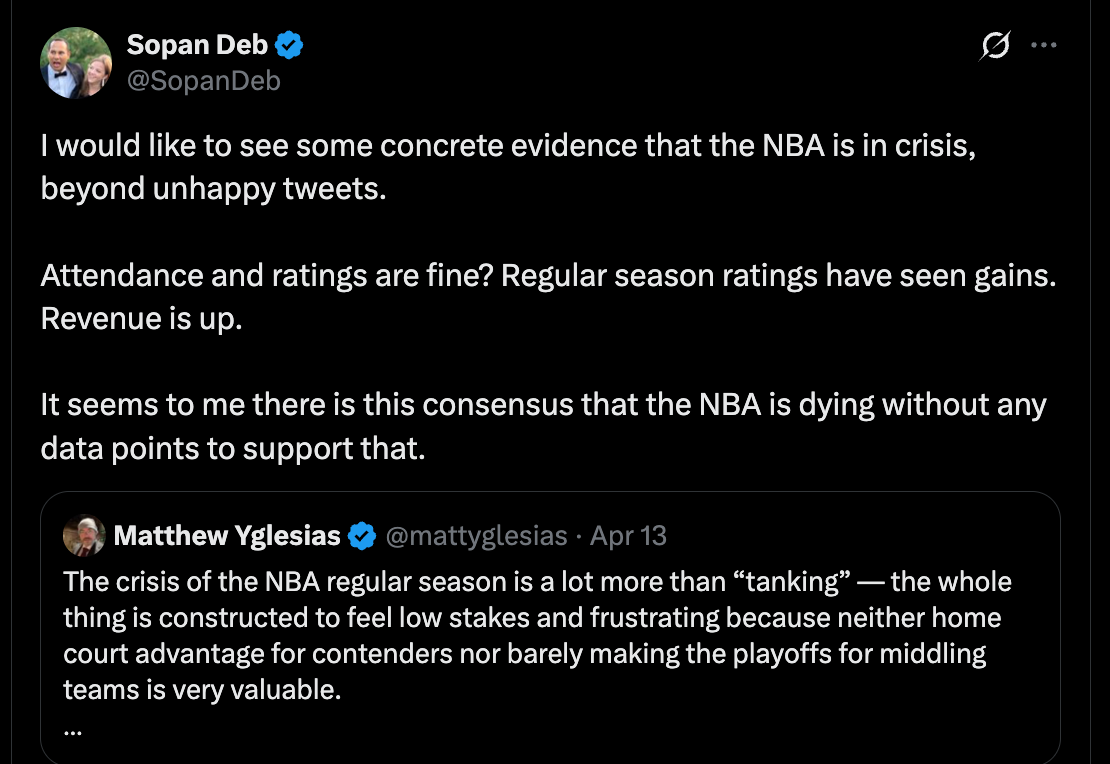 On Monday, New York Times writer Sopan Deb posted the following take that widespread talk of NBA decline might just be an Internet myth. He said it in response to a Slow Boring attempt at fixing a league in crisis.