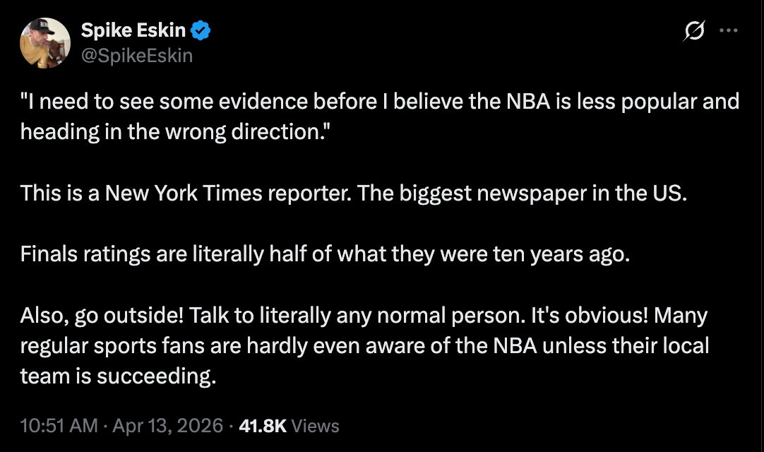 On some level I think the NBA’s problems stem from the league getting overpaid for media rights because streamers were desperate for content and agreed to uneconomic deals, which made the owners rich and reduced the financial pressure on them to improve the product.