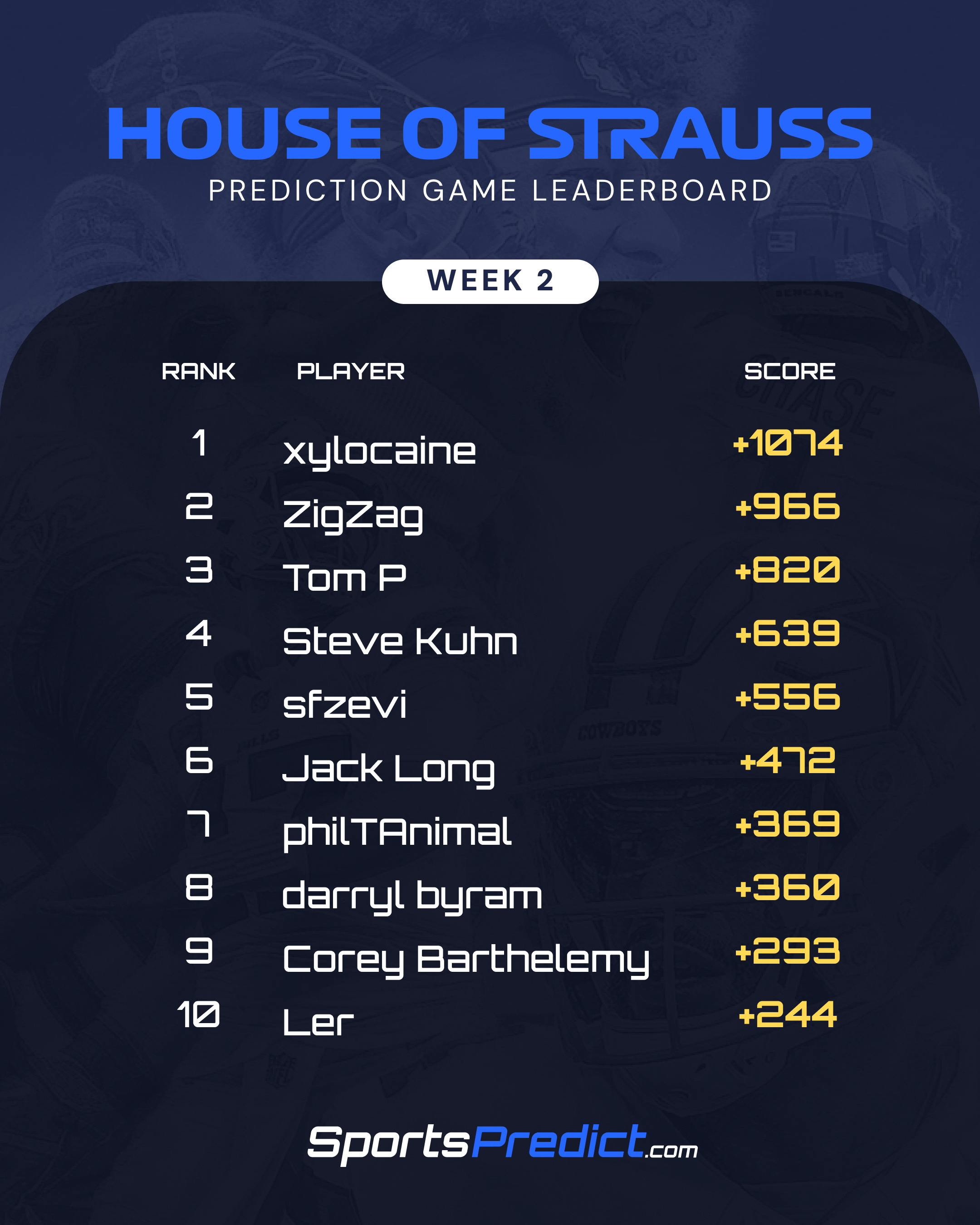 So the Week 2 NFL SportsPredict winner is Xylocaine, who is now afforded a free House of Strauss subscription. Email me at houseofstrauss@substack.com if you wish to collect. Also, I sometimes forget to mention, you other people can email me there for story tips and ideas.