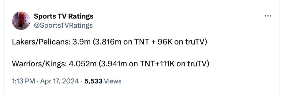 This brings me to the following question, now that the NBA regular season is in the rearview: What, exactly, was the point of the much touted In Season Tournament? Somehow I stirred controversy by calling the experiment an overall ratings disappointment. But here we are, end of the season, and there were zero season gains in an era where Nielsen’s evolving counting system sees other sports surge. Wasn’t the point to increase regular season interest?